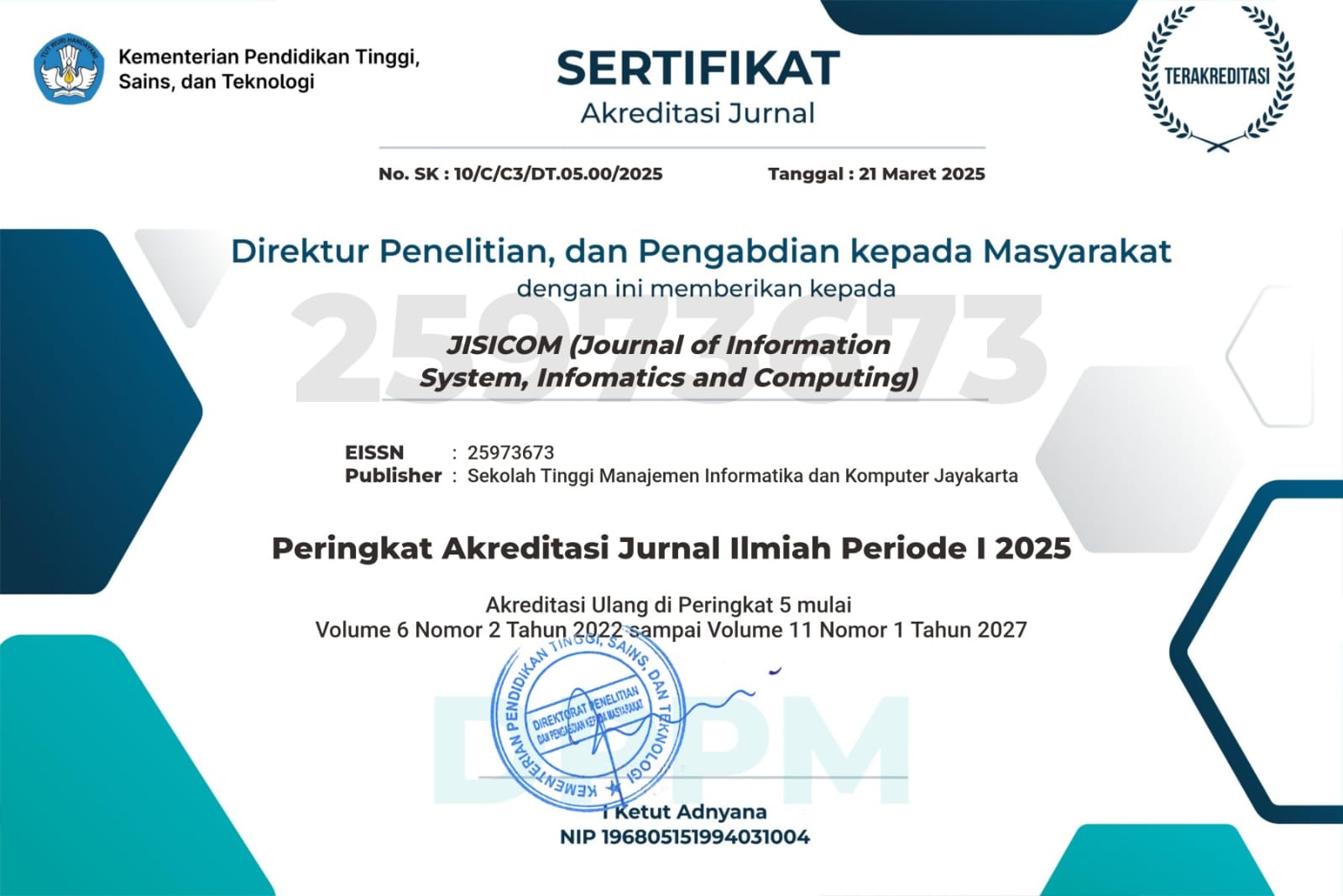 JISICOM (Journal of Information System, Informatics and Computing) It has been accredited based on the DECREE OF THE MINISTER OF RESEARCH AND TECHNOLOGY / HEAD OF THE NATIONAL RESEARCH AND INNOVATION AGENCY OF THE REPUBLIC OF INDONESIA, NUMBER 200 / M / KPT / 2020 ON THE ACCREDITATION RATING OF SCIENTIFIC JOURNALS PERIOD III OF 2020. JOURNAL OF INFORMATION SYSTEM, INFORMATICS AND COMPUTING, RANKED 5TH (SINTA 5), CALCULATED VOLUME 2 NUMBER 2 (2018) TO VOLUME 7 NUMBER 1 (2023), WAS SET IN JAKARTA, ON DECEMBER 23, 2020.